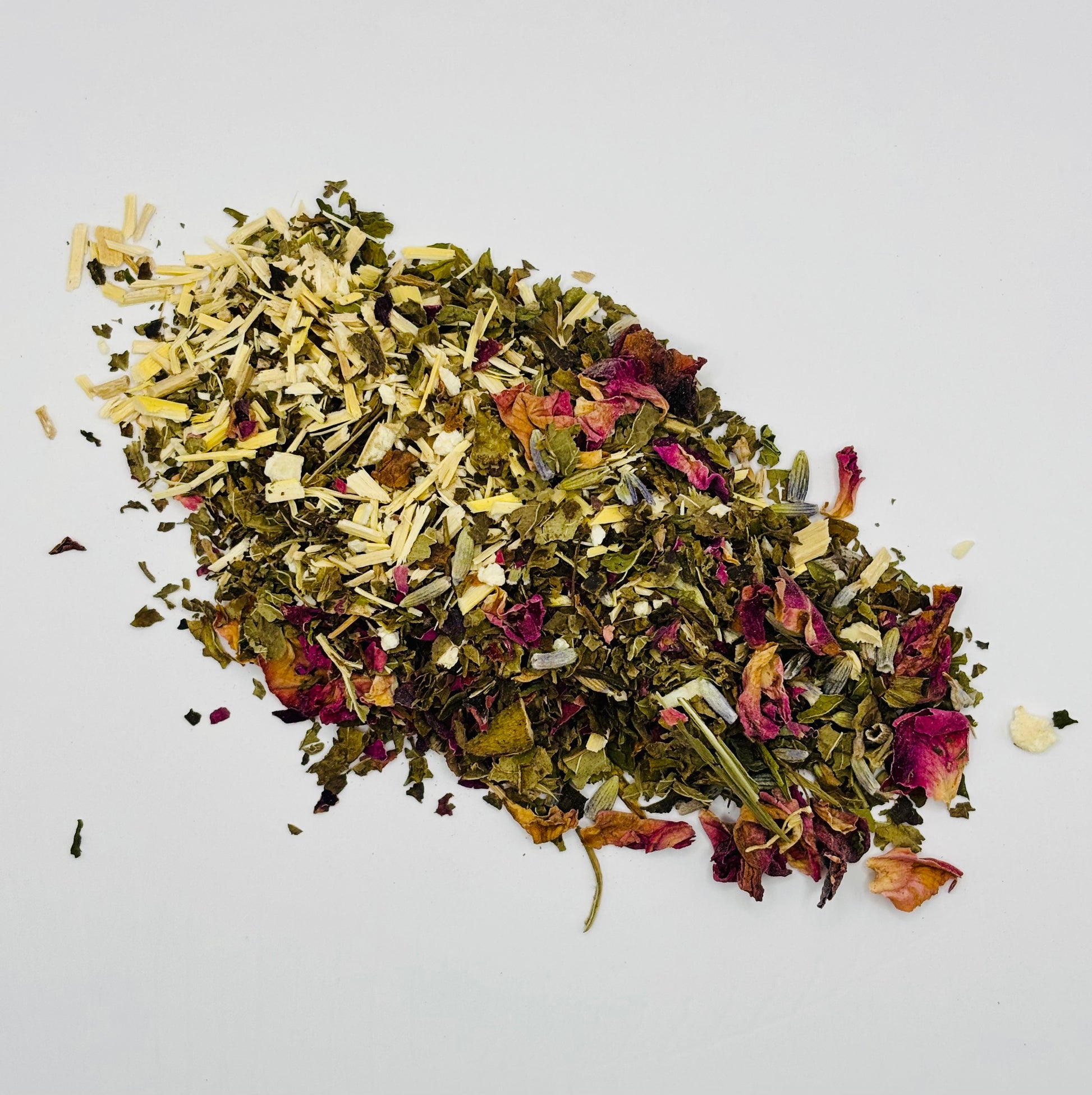 Rooibos, Passionflower, Rhodiola Rosea, Rose, Lemon Balm, Licorice, Eleuthero, Spearmint, and Lavender